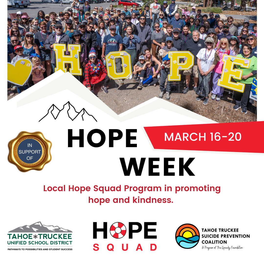Tahoe Truckee Unified School District’s Hope Squad Programs will be celebrating "Hope Week," during regular school hours during the week of March 16-20, in an effort to raise awareness of suicide prevention and mental wellness.
