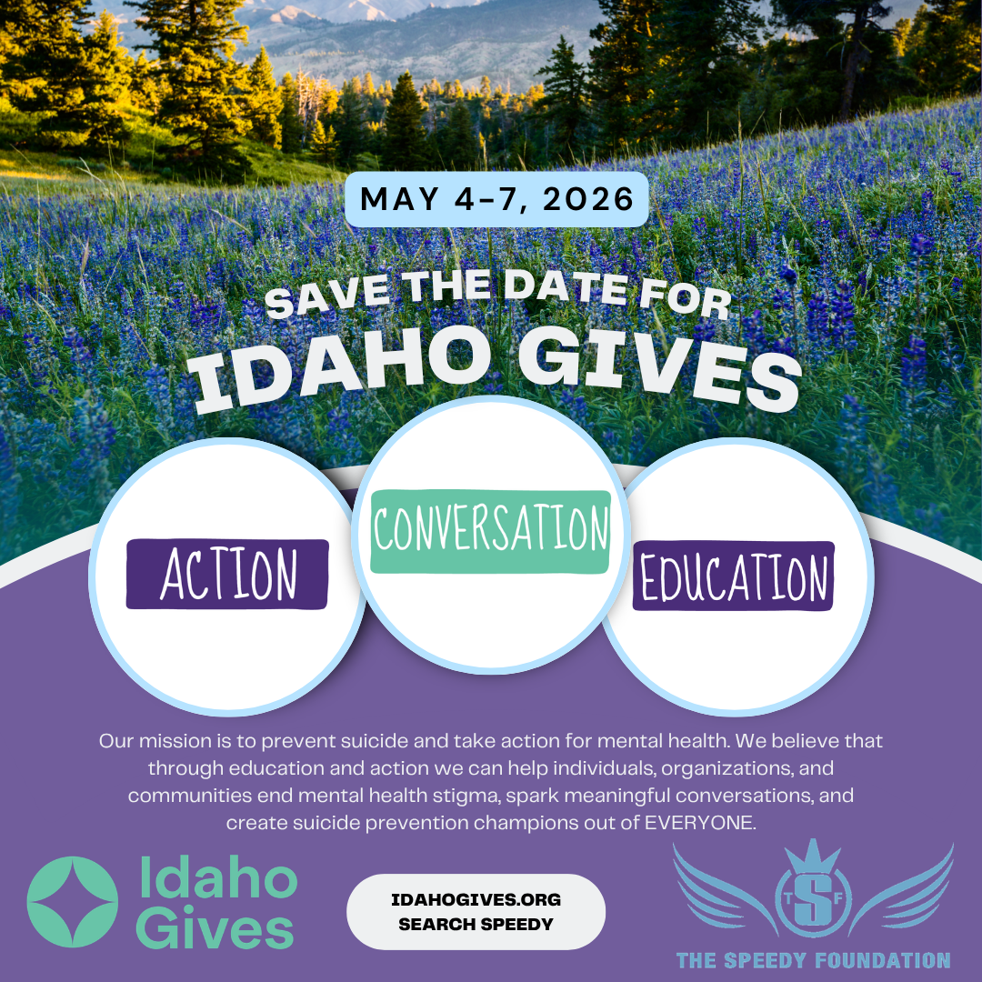 For The Speedy Foundation, Idaho Gives is an important time for us to share our mission and invite support for our work in mental health education, conversation, and action. Donations collected during this campaign help us continue providing resources, expanding outreach, and supporting efforts that reduce stigma and increase access to mental health education.
